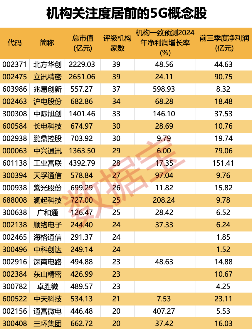 证券时报·数据宝对A股市场中,与5G相关的移动通讯终端及设备制造、基站建设、移动网络优化、系统集成以及运营商等领域个股进行梳理,筛选出机构关注度高(20家及以上机构参与评级)的个股,共计22只,供读者参考。