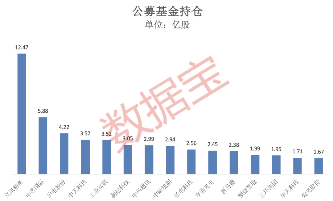 从公募基金持仓看,立讯精密、中芯国际、沪电股份排名前三,分别获得持仓12.47亿股、5.88亿股、4.22亿股;中天科技、工业富联、澜起科技持股量也均超过3亿股。
