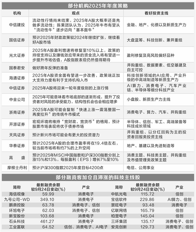 国泰君安2025年度策略推荐主题包括并购重组、数据要素、低空基建及自主可控。中信证券年度策略推荐主题包括AI算力、消费电子、汽车产业链、半导体等细分科技产业。