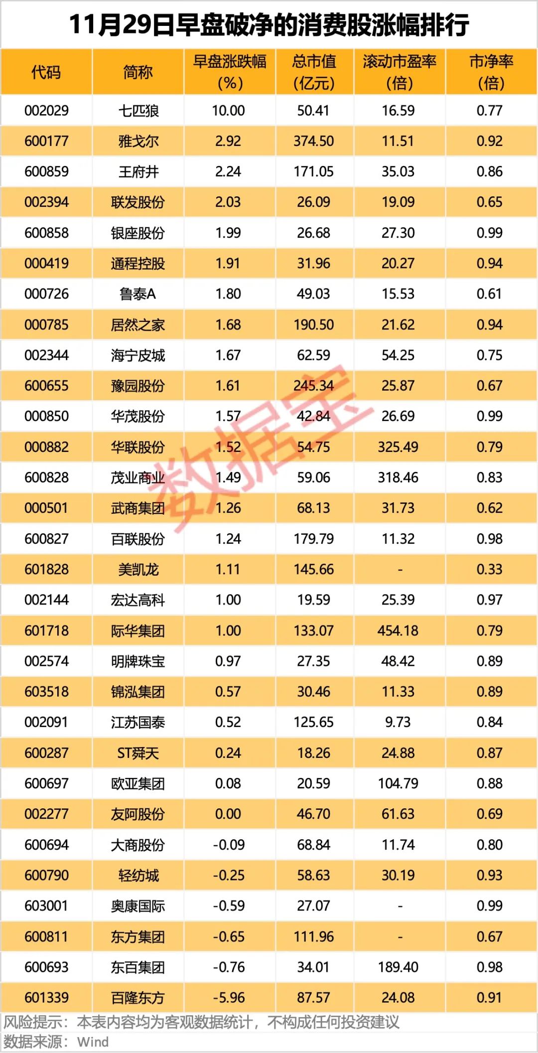 据证券时报·数据宝统计,在早盘上涨的4个消费板块中,部分个股仍处于破净状态,主要集中在商贸零售、纺织服装板块,合计共30只,包括美凯龙、鲁泰A、武商集团等。