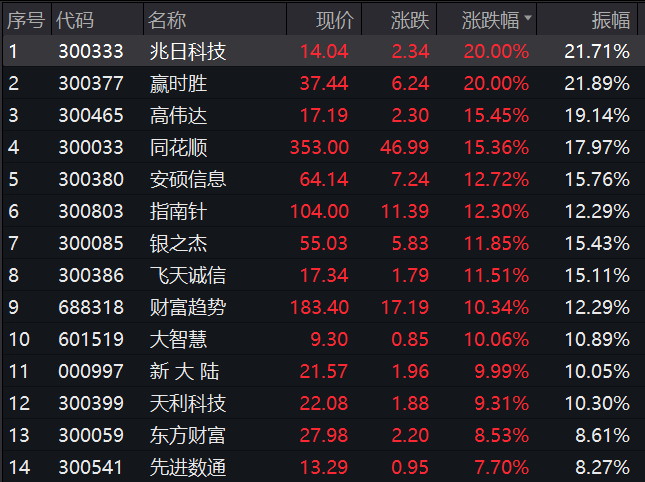 早盘,A股金融科技板块尾盘强势拉升,收盘涨6.3%领涨市场,兆日科技、赢时胜均“20cm”涨停,大智慧、新大陆涨停,高伟达、同花顺、安硕信息等涨10%以上。