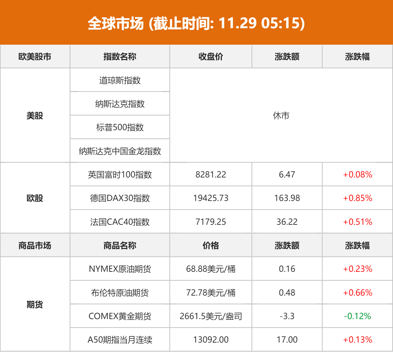 美股市场:受美国感恩节假期影响,美国股市和债市11月28日(美东时间周四)休市一日。