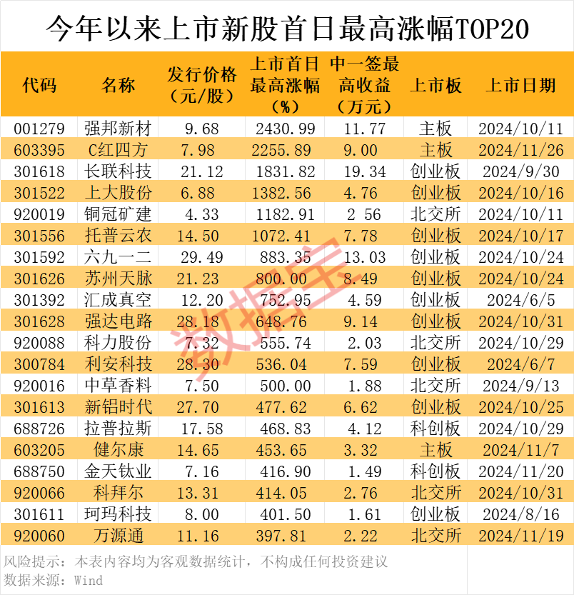 近期,新股市场热度高涨,再次迎来“大肉签”。上周3只新股的上市首日平均涨幅高达892.17%。其中,11月26日上市的C红四方盘中一度大涨超2200%,收盘仍上涨1917.42%,单签收益约7.65万元,最高收益11.77万元。C红四方的上市首日表现超过此前强邦新材的1738.95%,成为年内上市首日涨幅最高的新股。