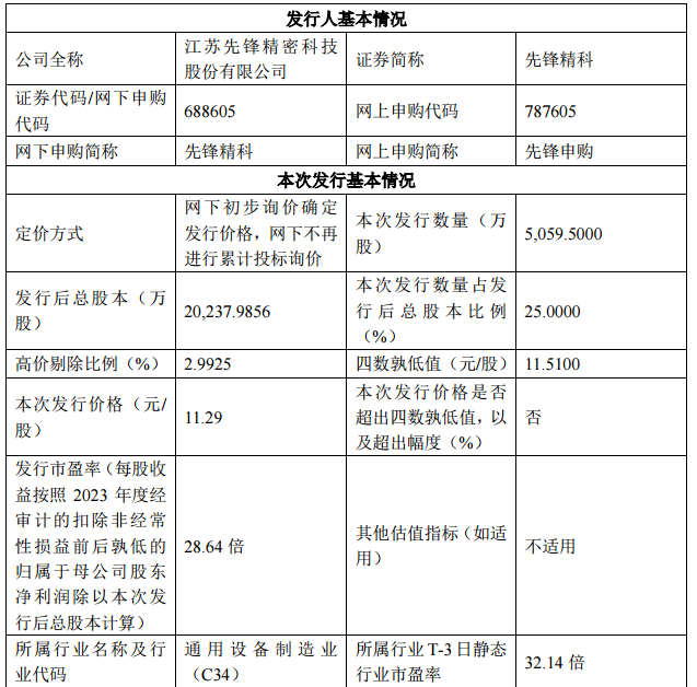 先锋精科拟于周一(12月2日)申购,申购代码为787605,发行价为11.29元/股,发行市盈率为28.64倍,参考行业市盈率为32.14倍。此次总发行数量为5059.50万股,包含网上发行数量为1214.25万股。投资者参与网上申购先锋精科,申购数量上限为1.2万股,顶格申购需配市值为12万元。