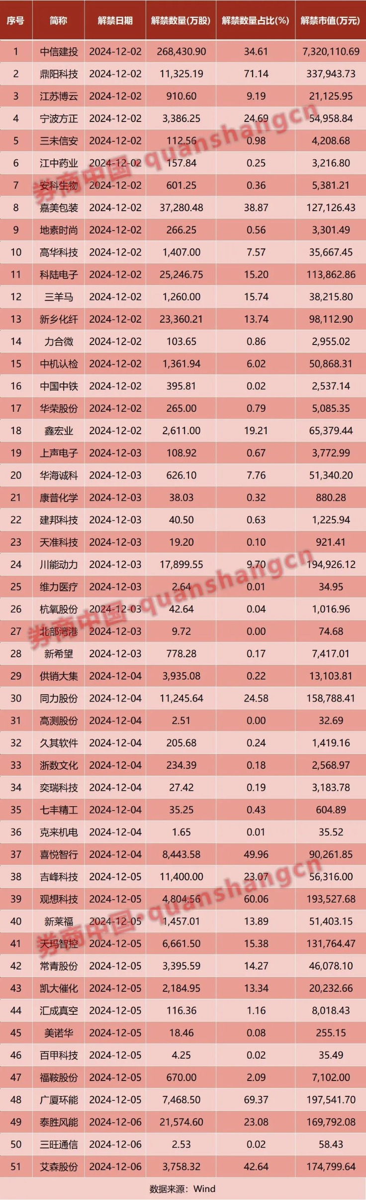 本周(12月2日至12月6日),A股市场将有51家上市公司迎来限售股解禁。以个股最新价计算,51家上市公司解禁股对应市值合计987.86亿元。从解禁规模上看,中信建投居首,解禁市值高达732.01亿元;鼎阳科技以33.79亿元的解禁市值排在第二。本周有19股解禁比例高于10%,具体来看,鼎阳科技、广厦环能、观想科技解禁比例排名前三,依次为71.14%、69.37%、60.06%。