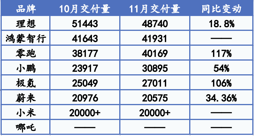 12月1日,多家造车新势力如期公布11月月度成绩单,其中理想和鸿蒙智行依旧位居第一、第二,零跑、小鹏、极氪再度创下销量新高,“后起之秀”小米汽车则再度交出了超两万辆的成绩,并再一次调高了全年销量目标。