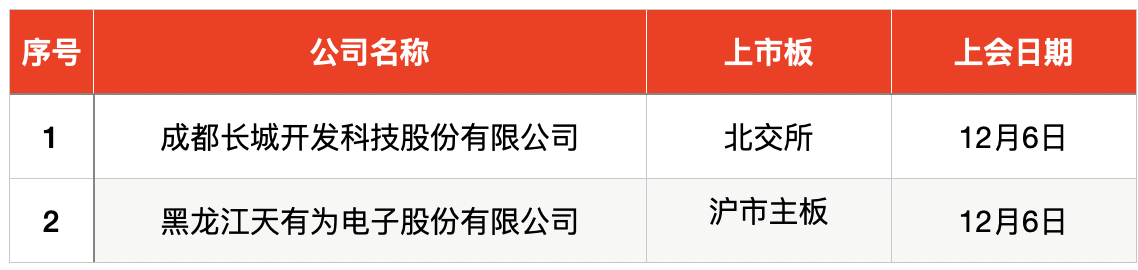 目前,北交所、上交所已发布新一期审议会议公告。北交所上市委员会定于12月6日召开2024年第25次审议会议,审议的发行人是成都长城开发科技股份有限公司。上交所上市审核委员会定于12月6日召开2024年第33次上市审核委员会审议会议,审议的发行人是黑龙江天有为电子股份有限公司。
