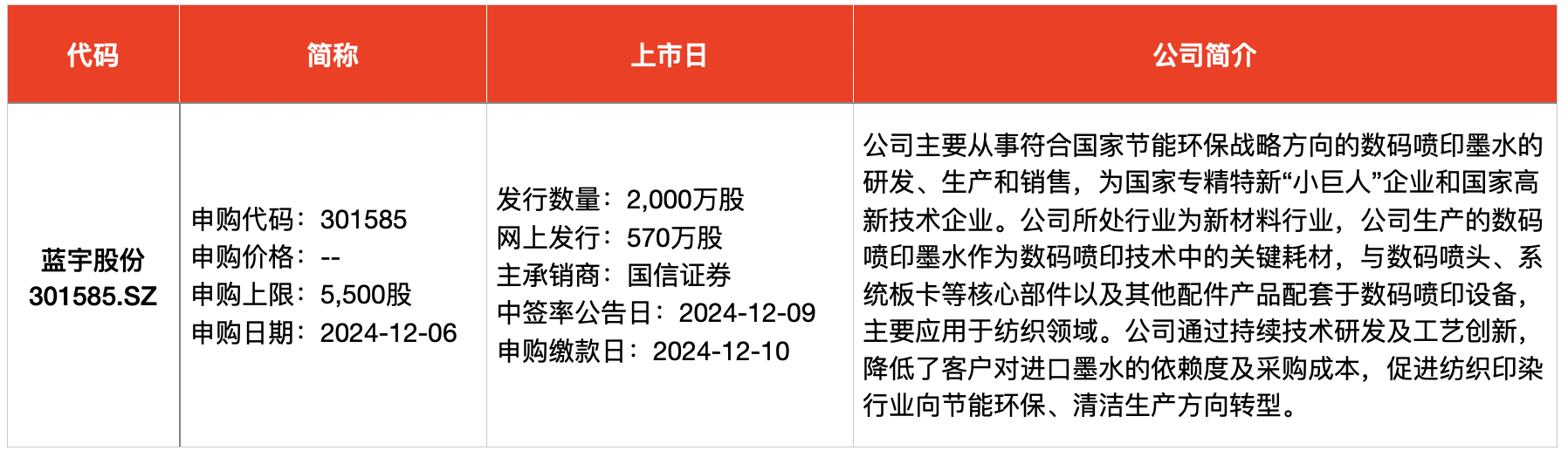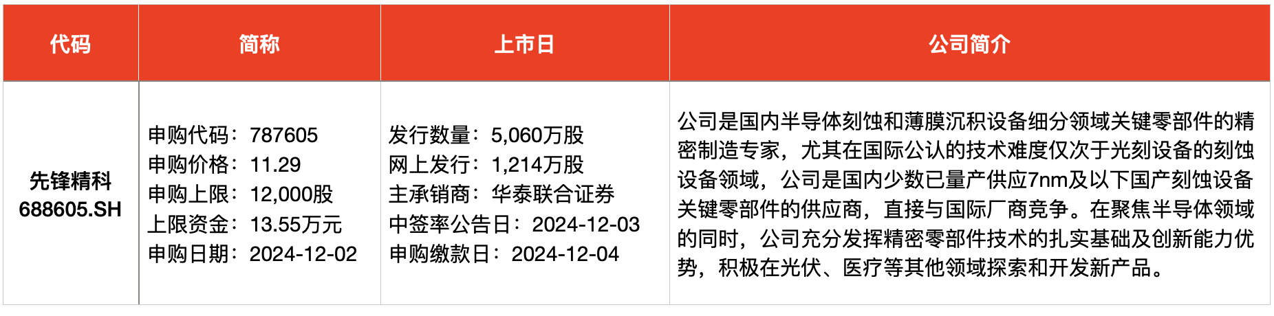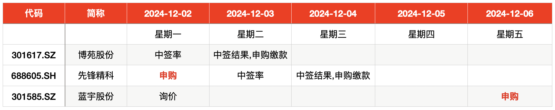 澎湃新闻根据公开信息梳理统计,本周(12月2日-12月6日),有2只新股安排网上申购。申购的新股为江苏先锋精密科技股份有限公司(简称“先锋精科”,688605.SH)、浙江蓝宇数码科技股份有限公司(简称“蓝宇股份”,301585.SZ)。