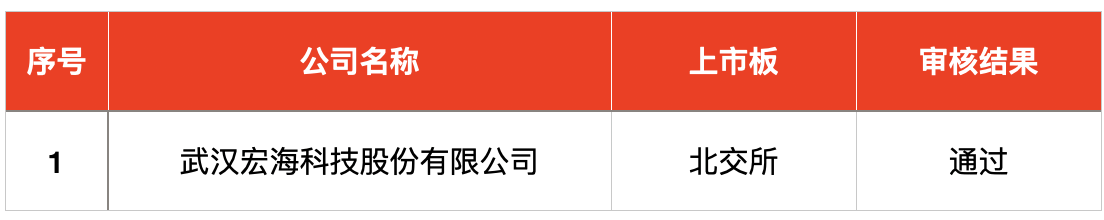 发审委审核方面,上周仅北交所召开新的审议会议,武汉宏海科技股份有限公司(下称“宏海科技”)获得通过。