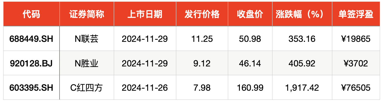 上周共有3只新股上市,分别为中盐安徽红四方肥业股份有限公司(简称“红四方”,603395.SH)、联芸科技(杭州)股份有限公司(简称“联芸科技”,688449.SH)、胜业电气股份有限公司(简称“胜业电气”,920128.BJ)。