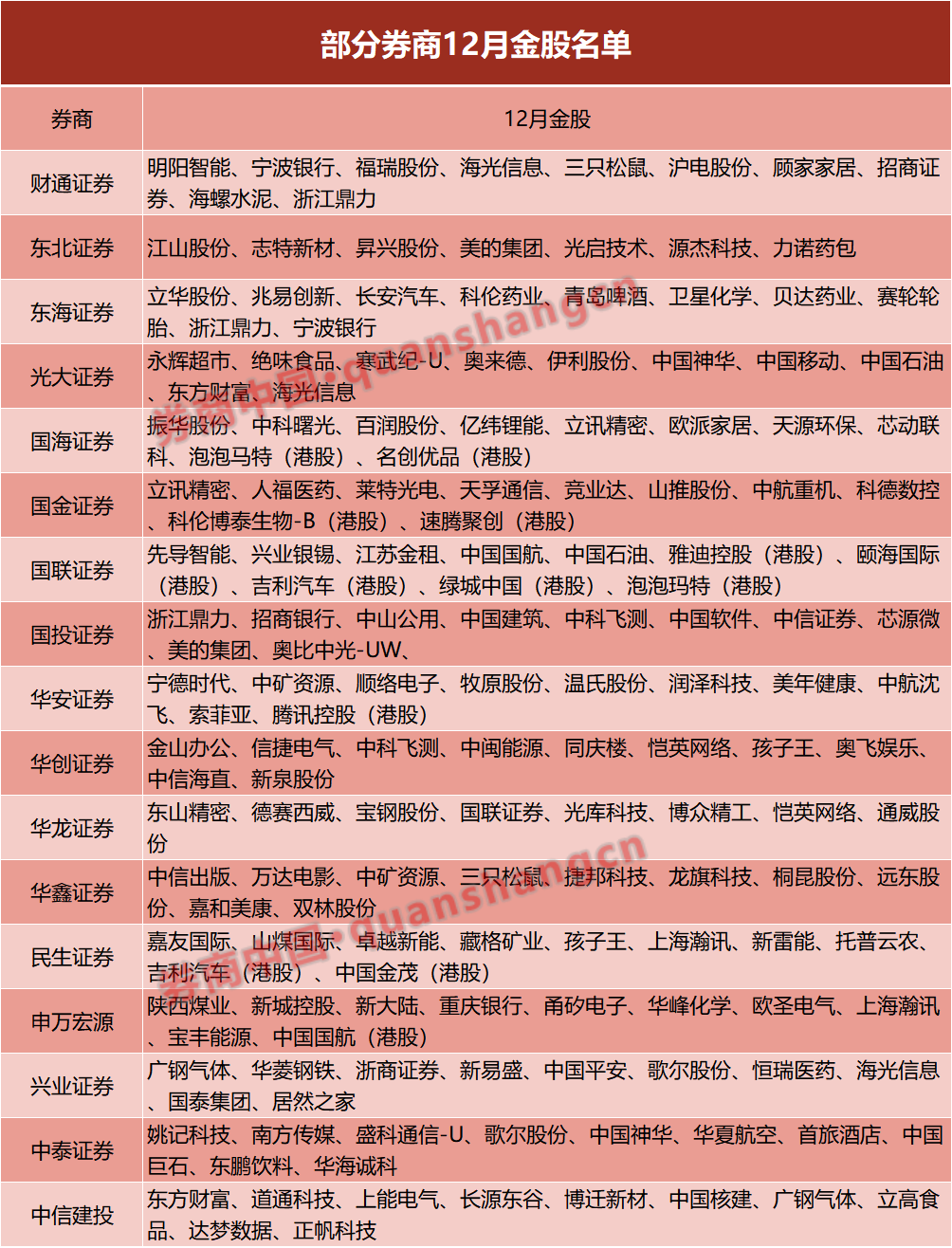 在发布券商12月金股的同时,各券商也发布了最新的月度策略展望。券商普遍看好12月A股市场岁末年初的跨年行情,但配置方向上略有分歧。