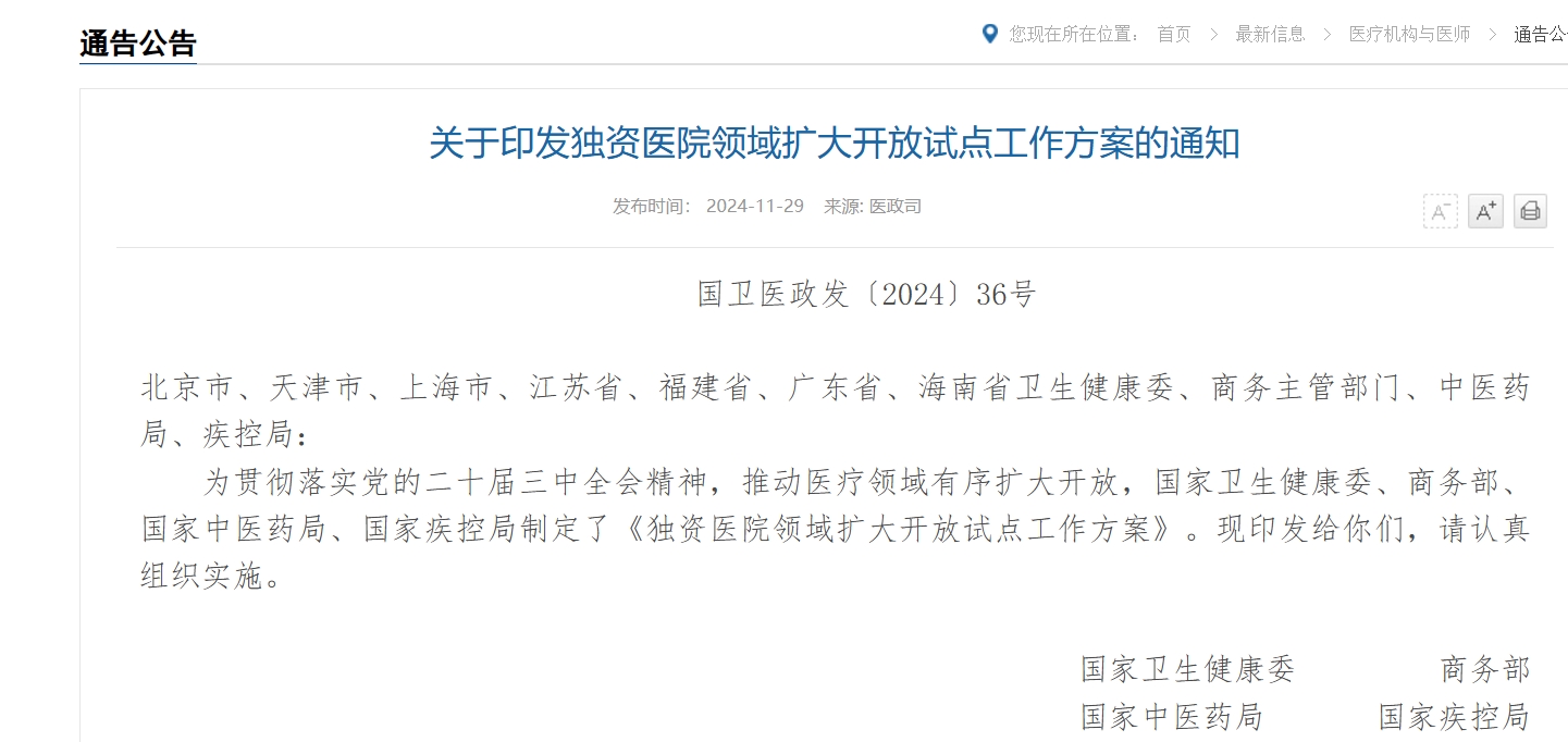 11月29日,国家卫生健康委、商务部、国家中医药管理局、国家疾控局四部门印发《独资医院领域扩大开放试点工作方案》(简称《方案》),明确允许在北京、天津、上海、南京、苏州、福州、广州、深圳和海南全岛设立外商独资医院(中医类除外,不含并购公立医院)。