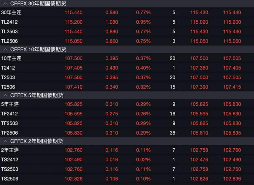 国债期货全线飘红。数据显示,截至当日收盘,30年期国债期货主力合约涨0.77%,报115.44元,为9月底以来新高;10年期国债期货主力合约涨0.37%、报107.50元,5年期国债期货主力合约涨0.29%、报105.83元,均创收盘价新高;2年期国债期货主力合约涨0.11%,报102.76元。