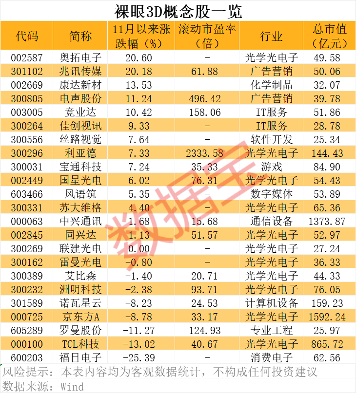 据证券时报·数据宝统计,布局裸眼3D的A股上市公司共有23家,主要集中在光学光电子行业,其他还有广告营销、数字媒体等行业上市公司。从股价上来看,概念股11月以来平均上涨2.38%,其中奥拓电子、兆讯传媒、康达新材、电声股份、竞业达累计涨幅超过10%。