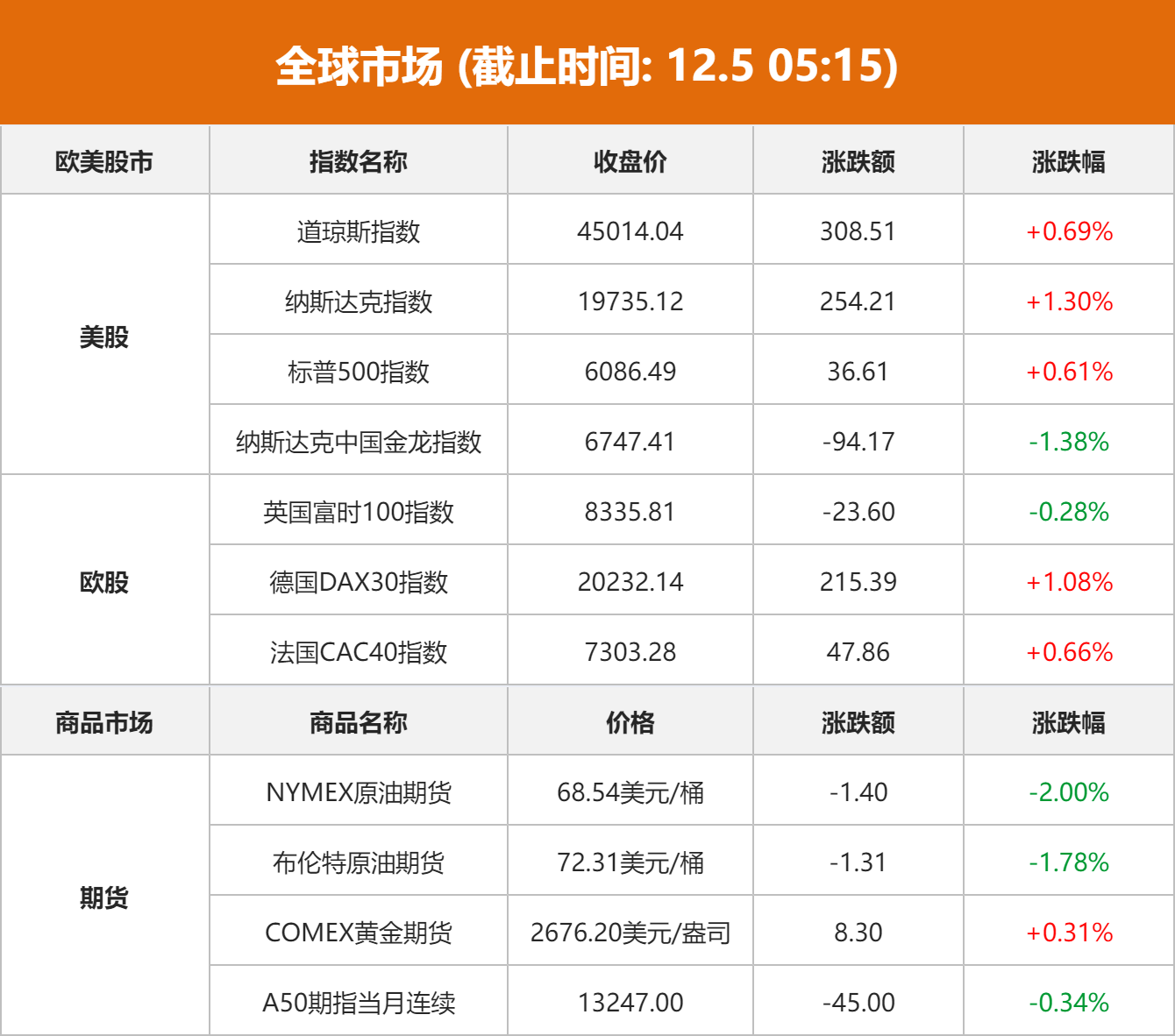 美股市场:美股三大指数均创历史新高,道指首次收于45000点上方,截至当天收盘,道琼斯工业平均指数比前一交易日上涨308.51点,收于45014.04点,涨幅为0.69%;标准普尔500种股票指数上涨36.61点,收于6086.49点,涨幅为0.61%;纳斯达克综合指数上涨254.21点,收于19735.12点,涨幅为1.30%。