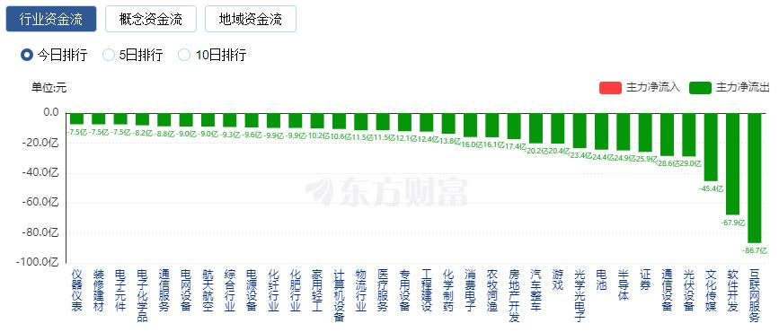 净流出方面,互联网服务、软件开发、文化传媒等净流出排名靠前,其中互联网服务净流出86.70亿元。