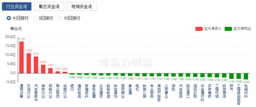 行业资金方面,截至收盘,通用设备、石油行业、汽车零部件等净流入排名靠前,其中通用设备净流入17.51亿。