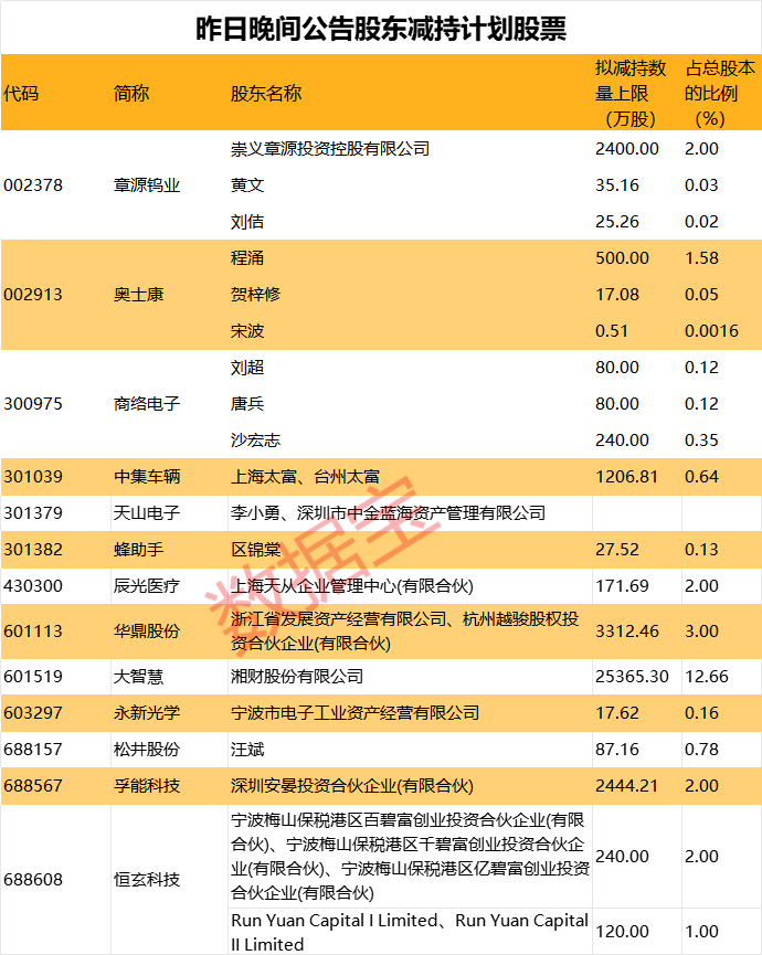 天山电子股东李小勇及其一致行动人中金蓝海拟减持不超过总股本3%;华鼎股份股东浙江省发展资产经营有限公司、杭州越骏股权投资合伙企业(有限合伙)拟减持不超过3312.46万股,占总股本比例不超过3%;中集车辆5%以上的股东上海太富、台州太富因退出需要,计划减持1206.81万股公司股份,占总股本的0.64%。