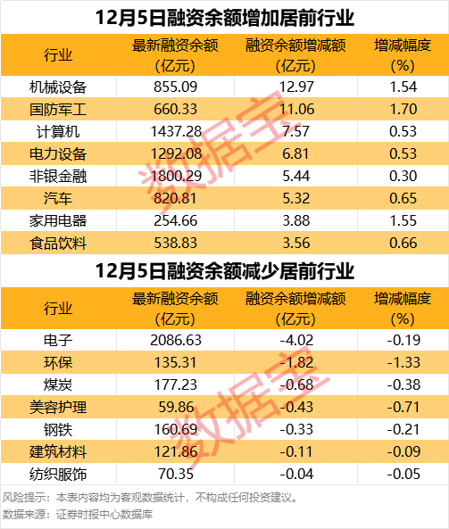 分行业统计,申万所属一级行业有24个行业融资余额增加,机械设备行业增加最多,较上一日增加12.97亿元;融资余额增加居前的行业还有国防军工、计算机、电力设备等,分别增加11.06亿元、7.57亿元、6.81亿元;融资余额减少的行业有7个,电子、环保、煤炭等行业减少较多,分别减少4.02亿元、1.82亿元、6819.19万元。