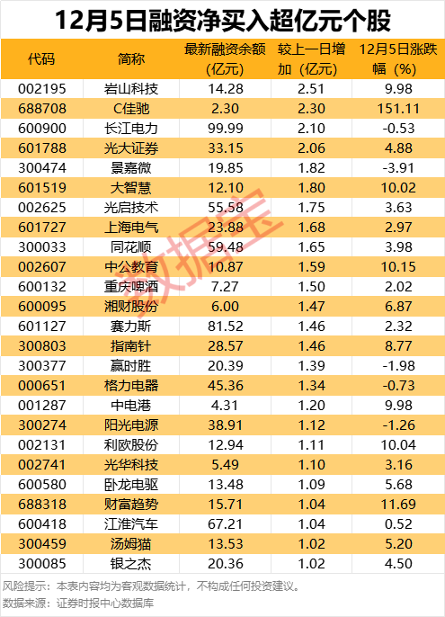 具体到个股,12月5日共有2030只股获融资净买入,净买入金额在千万元以上的有460只,其中25只融资净买入额超1亿元。岩山科技融资净买入额居首,当日净买入2.51亿元,其次是C佳驰、长江电力净买入金额分别为2.30亿元、2.10亿元,净买入居前的还有光大证券、景嘉微、大智慧等。