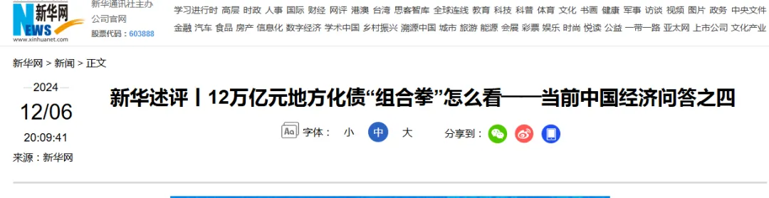 值得注意的是,12月6日晚间,新华社发布了针对财政政策的文章——《12万亿元地方化债“组合拳”怎么看——当前中国经济问答之四》。