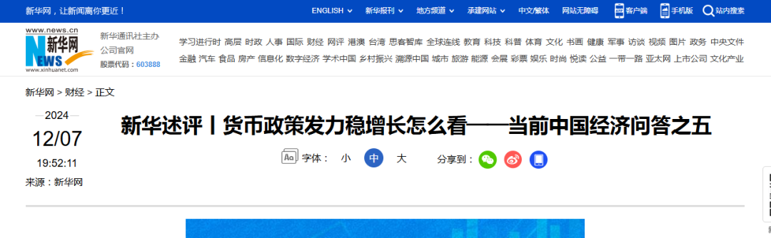 12月7日晚间,新华社发布文章《货币政策发力稳增长怎么看——当前中国经济问答之五》。