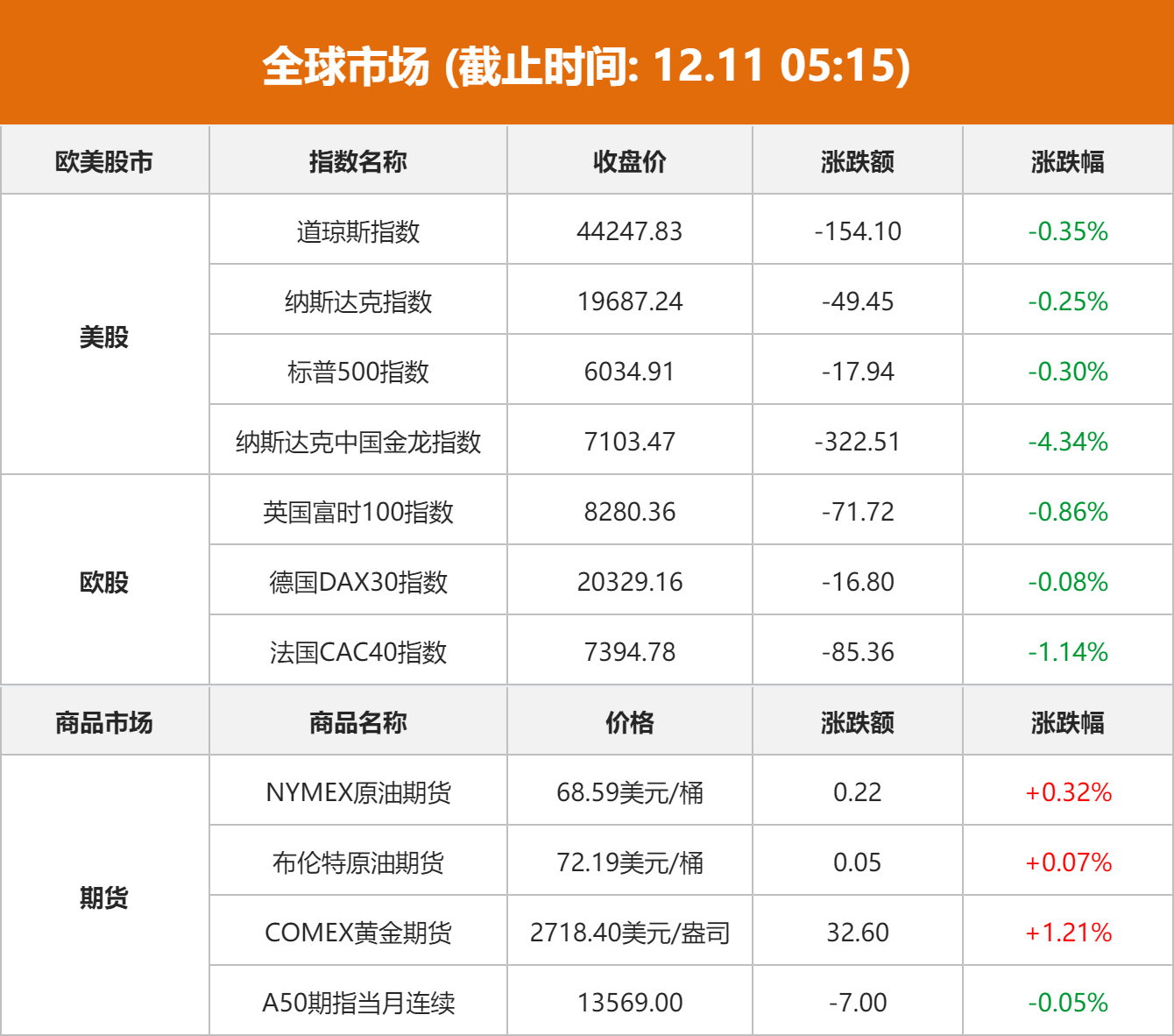 商品市场:国际油价上涨,截至当天收盘,纽约商品交易所2025年1月交货的轻质原油期货价格上涨22美分,收于每桶68.59美元,涨幅为0.32%;2025年2月交货的伦敦布伦特原油期货价格上涨5美分,收于每桶72.19美元,涨幅为0.07%。国际金价方面,COMEX黄金期货上涨32.60美元/盎司,涨幅1.21%,报2718.40美元/盎司。