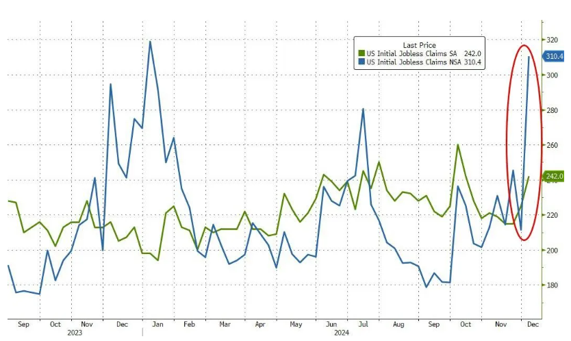 12月12日,美国劳工部公布的最新数据显示,美国12月7日当周首次申请失业救济人数24.2万人,跃升至2个月来的最高水平,高于预期22万人,也高于前值22.4万人。