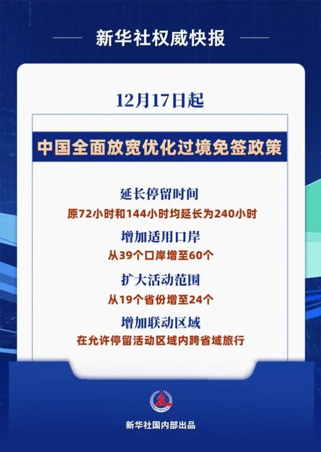 国家移民管理局12月17日发布公告,即日起全面放宽优化过境免签政策,将过境免签外国人在境内停留时间由原72小时和144小时均延长为240小时(10天),同时新增21个口岸为过境免签人员入出境口岸,并进一步扩大停留活动区域。