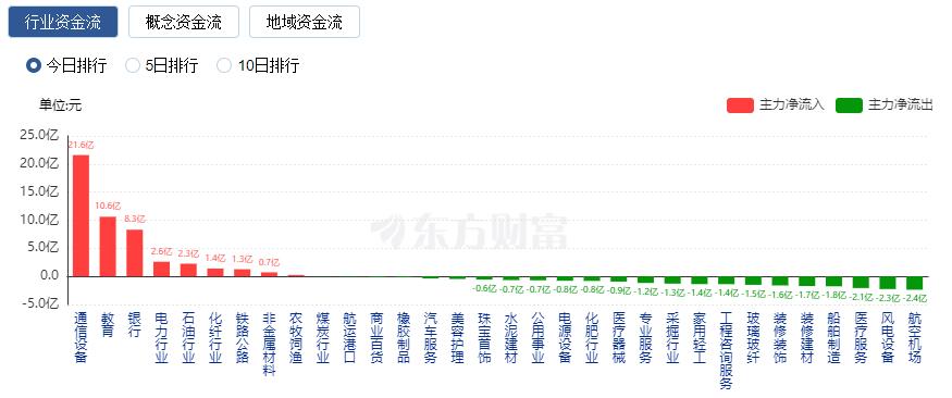 行业资金方面,截至收盘,通信设备、教育、银行等净流入排名靠前,其中通信设备净流入21.59亿。