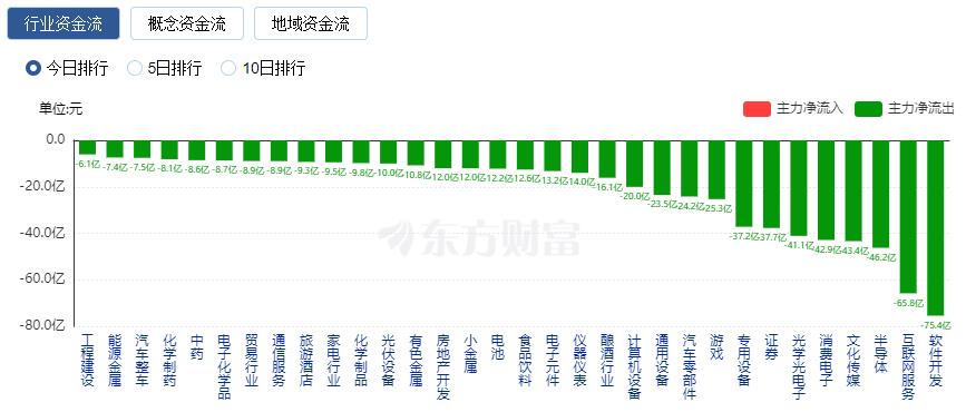 净流出方面,软件开发、互联网服务、半导体等净流出排名靠前,其中软件开发净流出75.44亿元。