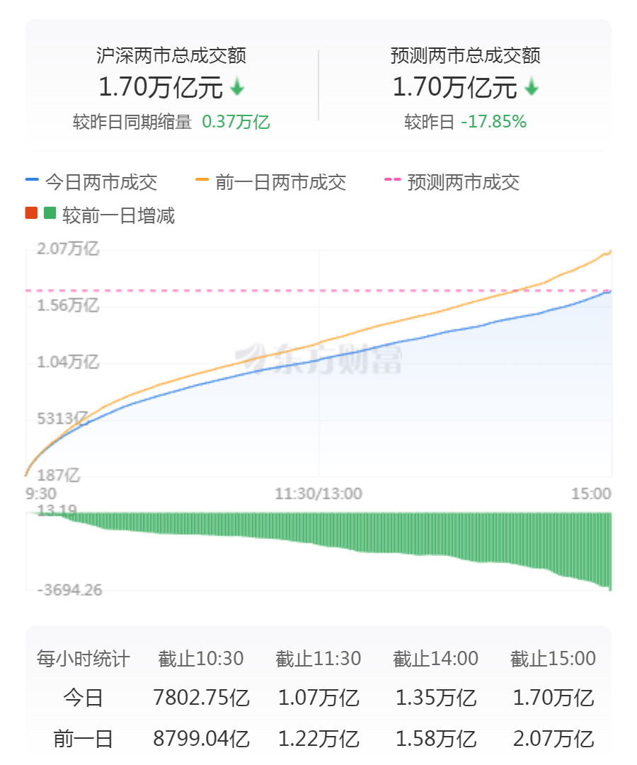 A股三大指数今日集体回调,截止收盘,沪指跌0.16%,收报3386.33点;深证成指跌1.30%,收报10573.92点;创业板指跌1.51%,收报2201.53点。沪深两市成交额达到1.7万亿元,较上周五缩量约3700亿。