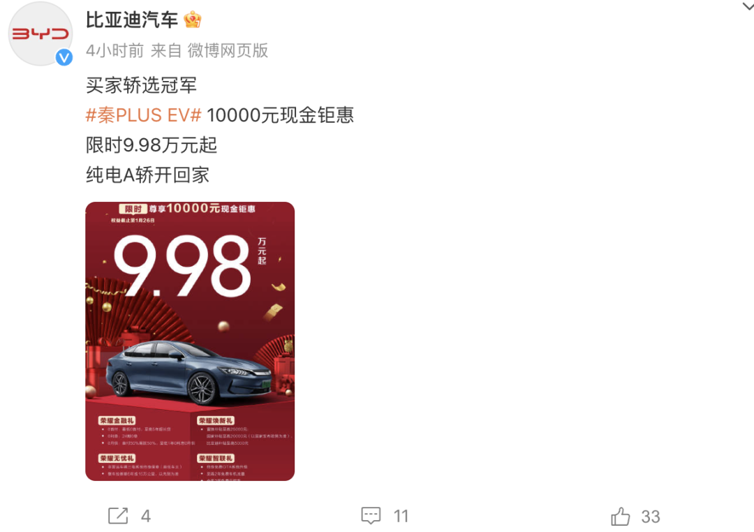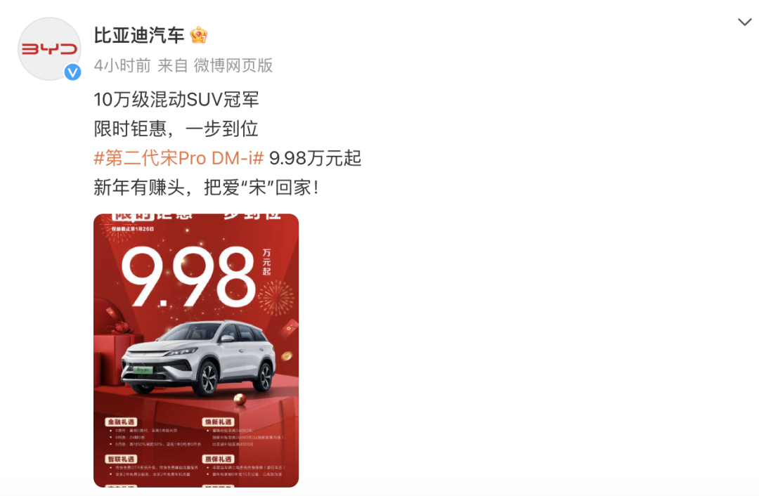 12月27日,“比亚迪汽车”官方微博发文称,即日起至2025年1月26日,对秦PLUS EV荣耀版限时优惠1万元,对第二代宋Pro DM-i也进行限时优惠活动,优惠后两款车型起售价均为9.98万元。并且,上述两款车型置换补贴最高分别为2.5万元和2.4万元。此外,比亚迪还针对汉唐家族推出了限时送至高5000元的全车保险活动。