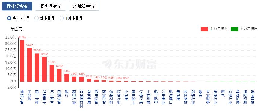行业资金方面,截至收盘,通信设备、半导体、电子元件等净流入排名靠前,其中通信设备净流入33.05亿。