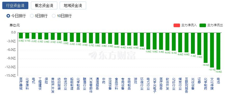 净流出方面,电池、文化传媒、化学制药等净流出排名靠前,其中电池净流出12.84亿元。