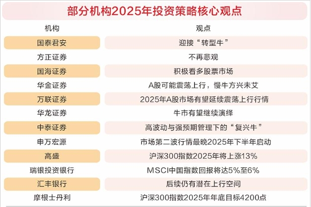 外资也看好A股今年表现。高盛预计,MSCI中国指数和沪深300指数在2025年将分别上涨15%和13%。瑞银投资银行预计,2025年MSCI中国指数的股价回报将达5%至6%,并认为任何回档都将为投资者提供更具吸引力的买点。摩根士丹利对沪深300指数设定的2025年年底目标是4200点,相比最新点位有近7%的升幅。