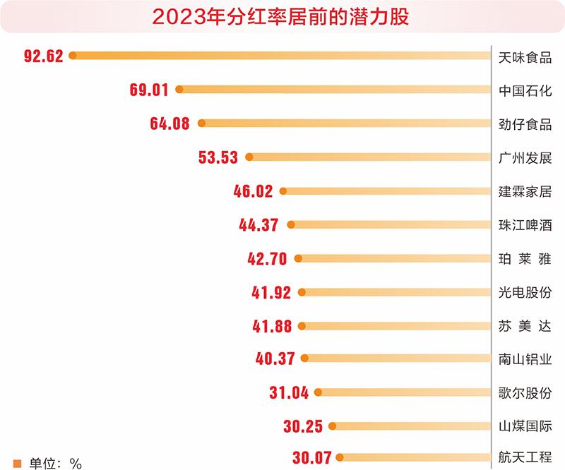 分红比例较高是潜力股的另一个标签。2021年至2023年,潜力股现金分红比例中位数分别达到30.33%、35.56%和41.88%。中国石化、劲仔食品、广州发展、建霖家居、珠江啤酒、光电股份、苏美达等个股连续3年现金分红比例超过40%;天味食品、珀莱雅、山煤国际、航天工程、明星电力等个股连续3年现金分红比例超过20%。
