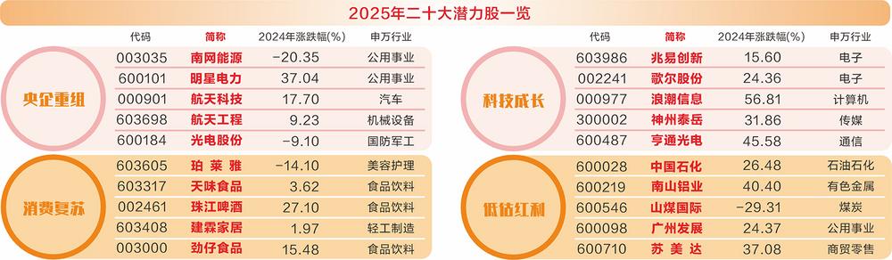 综合机构关注度、业绩、板块内相对估值以及均衡配置等角度,数据宝优中选优,推出2025年二十大潜力股(以下简称“潜力股”),包括5只央企重组概念、5只科技成长股、5只消费绩优股以及5只低估值红利股。