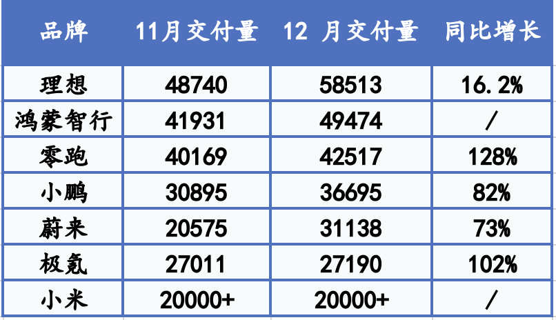 后起之秀小米汽车并未发布12月具体数据,不过据小米汽车官微,小米汽车2024年全年交付已超过13.5万辆,结合此前数据,其12月交付量超2万辆。