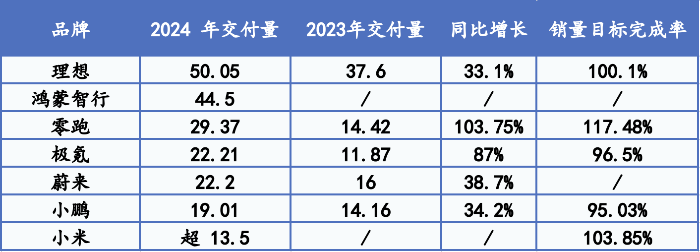 2024年全年成绩单也随之出炉。造车新势力全年销量均创新高,甚至多家实现同比翻倍增长。理想汽车以超50万辆的成绩再次拿下冠军,鸿蒙智行则以44.5万辆位居第二,第三名零跑汽车交付了近30万辆;后起之秀小米汽车同样增速亮眼,半年时间便从交付首月的七千辆攀升至超两万辆,超额完成全年13万辆目标。