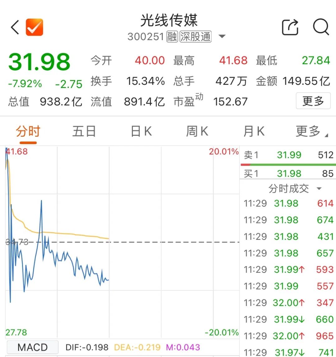 个股方面,热门高位股光线传媒早盘巨震,5分钟上演“准天地板”走势,振幅高达39.85%。截至午间收盘,光线传媒报31.98元/股,跌7.92%,成交额149.55亿元,位居A股第一。