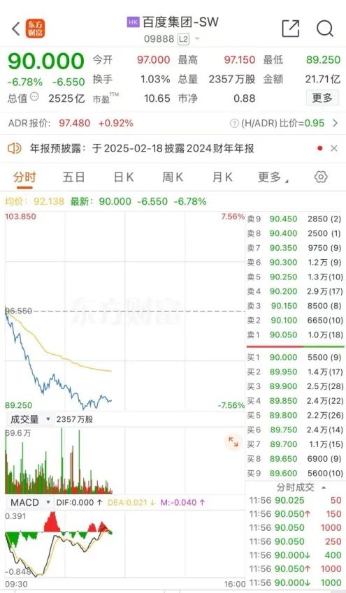 2月17日上午,百度集团-SW持续下挫,截至午盘跌幅扩大至6.78%,报90港元/股,成交额超21亿港元。