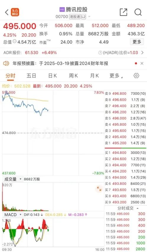 个股方面,腾讯控股高开逾6%,盘中涨幅超过7%,股价摸高至512港元/股。截至午盘,腾讯控股报495港元/股,涨4.25%,总市值4.54万亿港元,成交额报436.3亿港元,腾讯今日股价创三年多新高。