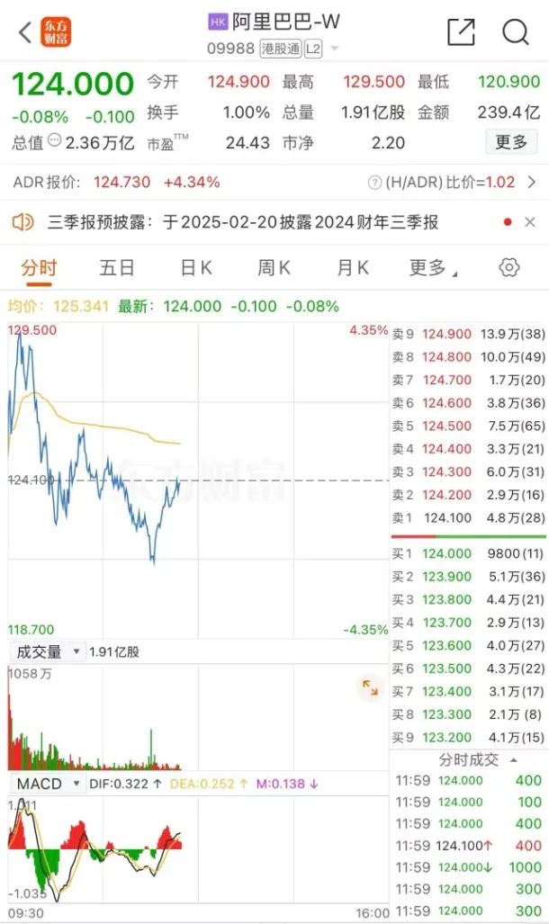 阿里巴巴-W今日则高位回调,早盘一度冲高涨超4%,盘中一度跌超1%。截至午盘,阿里巴巴-W跌0.08%,报124港元/股。