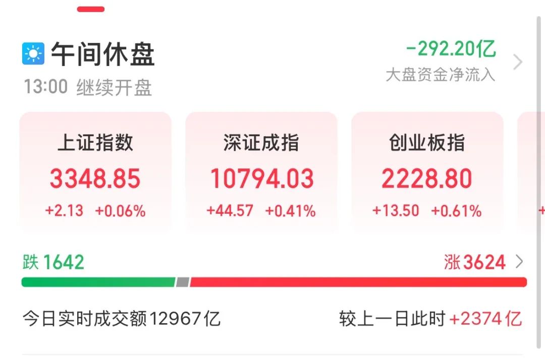 周一早盘,A股三大指数集体小幅上涨。截至午间收盘,上证指数涨0.06%,深证成指涨0.41%,创业板指涨0.61%。A股市场半日成交额12967亿元,较上个交易日同期放量2374亿元。