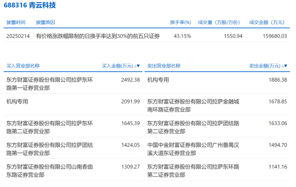 从龙虎榜来看,2月14日青云科技因换手率达43.15%而登上龙虎榜。从买卖情况来看,2月14日,机构专用席位同时出现在买入及卖出前五席中,当日机构买入2091.99万元,卖出1886.38万元。