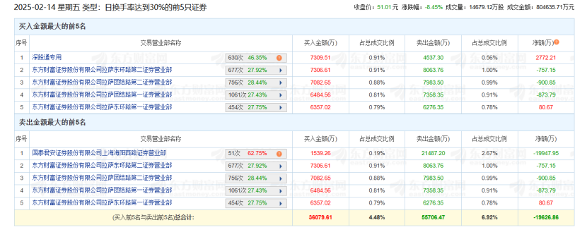 每日互动在2月14日因日换手率达到41.27%而登上龙虎榜。具体来看,买一是深股通专用席位,净买入2772.21万元,而买二至买五均为东方财富旗下的“拉萨天团”,这些营业部以散户占比高闻名。卖出第一的营业部则是国泰君安上海海阳西路证券营业部,卖二至卖五也是东方财富拉萨的营业部。