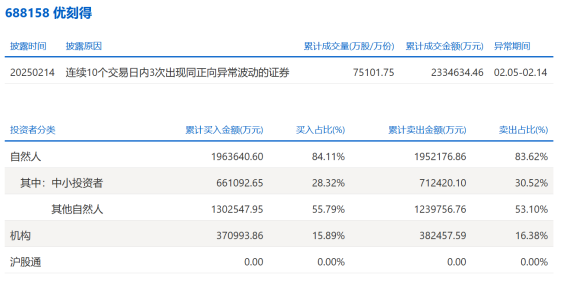 同时,优刻得还因连续10个交易日内3次出现同正向异常波动,披露了近10个交易日的投资者结构。数据显示,2月5日至2月14日,自然人(包括中小投资者及其他自然人)的成交占比在80%以上,机构呈现小额净卖出,机构累计买入37.10亿元,累计卖出38.25亿元。