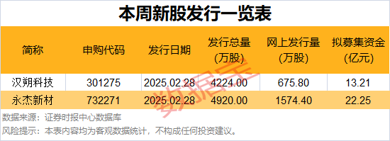 根据发行安排,本周暂有2只新股申购,汉朔科技、永杰新材均在本周五(2月28日)可申购。