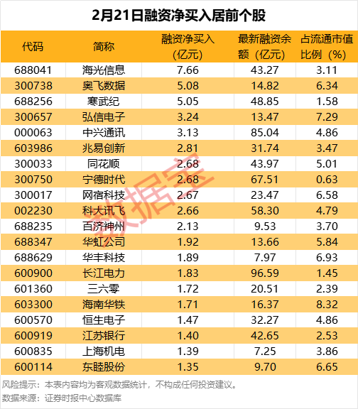 具体到个股,2月21日共有36只股融资净买入额超亿元。海光信息融资净买入额居首,当日净买入7.66亿元;其次是奥飞数据、寒武纪,融资净买入金额分别为5.08亿元、5.05亿元,融资净买入金额居前的还有弘信电子、中兴通讯、兆易创新等。